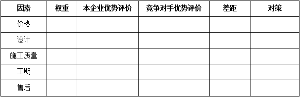 F、關(guān)鍵成交因素對比:對于某一個細分領(lǐng)域的客戶而言,成交的關(guān)鍵因素選項是相對清晰的,而這些因素對成交的影響權(quán)重是不同的,經(jīng)營分析就需要識別競爭對手在哪些關(guān)鍵成交因素上占據(jù)優(yōu)勢。例如:對于裝飾裝修工程行業(yè)的家庭客戶而言,其成交因素包括:價格、設(shè)計、施工質(zhì)量、工期、售后的維修維保服務等。對于一個收入中等的自住新房客戶而言,價格、設(shè)計因素、施工質(zhì)量是其主要成交因素,而對于商鋪、投資房產(chǎn)來說,工期的重要性不言而喻。如下表: